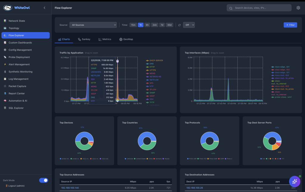WhiteOwl Network observability platform: all-in-one platform collects Netflow, IPFIX, sFlow, VPC flow logs, SNMP, device logs, device configurations, synthetic data and makes it explorable and actionable in an easy to use user interface operating on top of the fastest backend available.