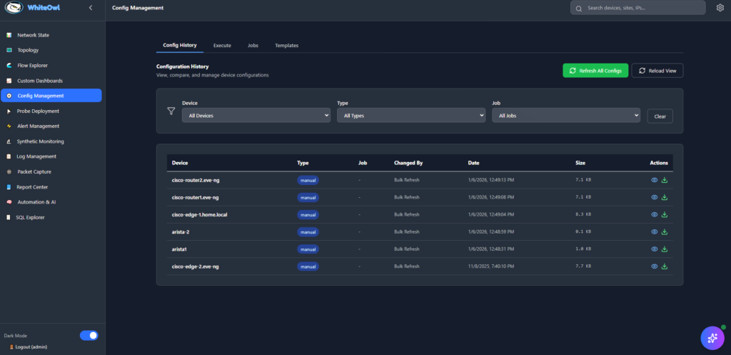 - Automated Configuration Collection – Use Ansible playbooks to reliably pull configurations from routers, switches, and firewalls.