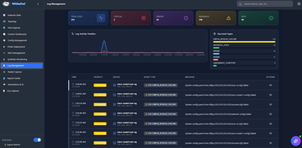 - Unified Log Visibility – Collect and centralize logs from routers, switches, firewalls, and other network devices in one searchable interface.